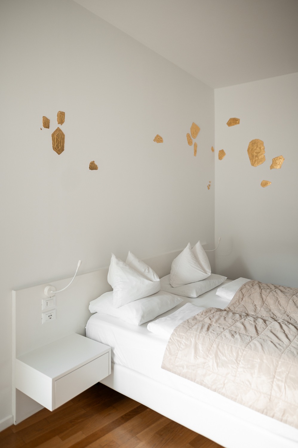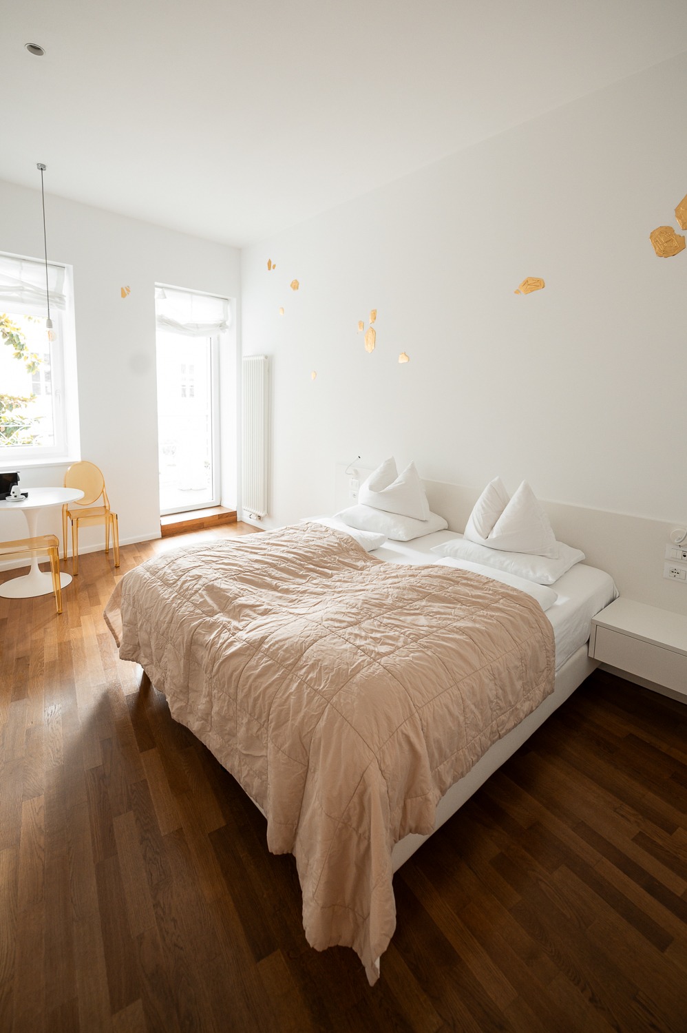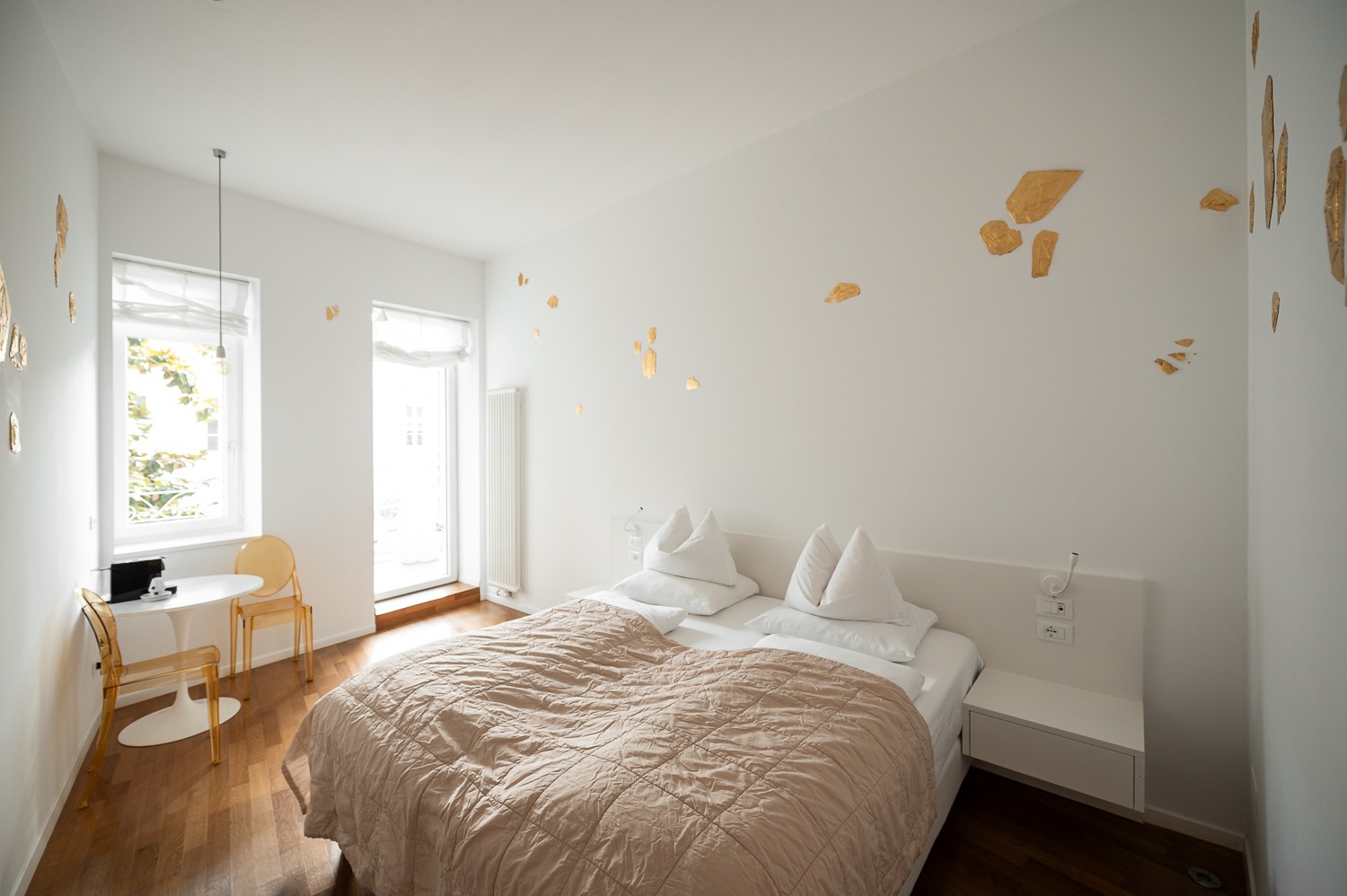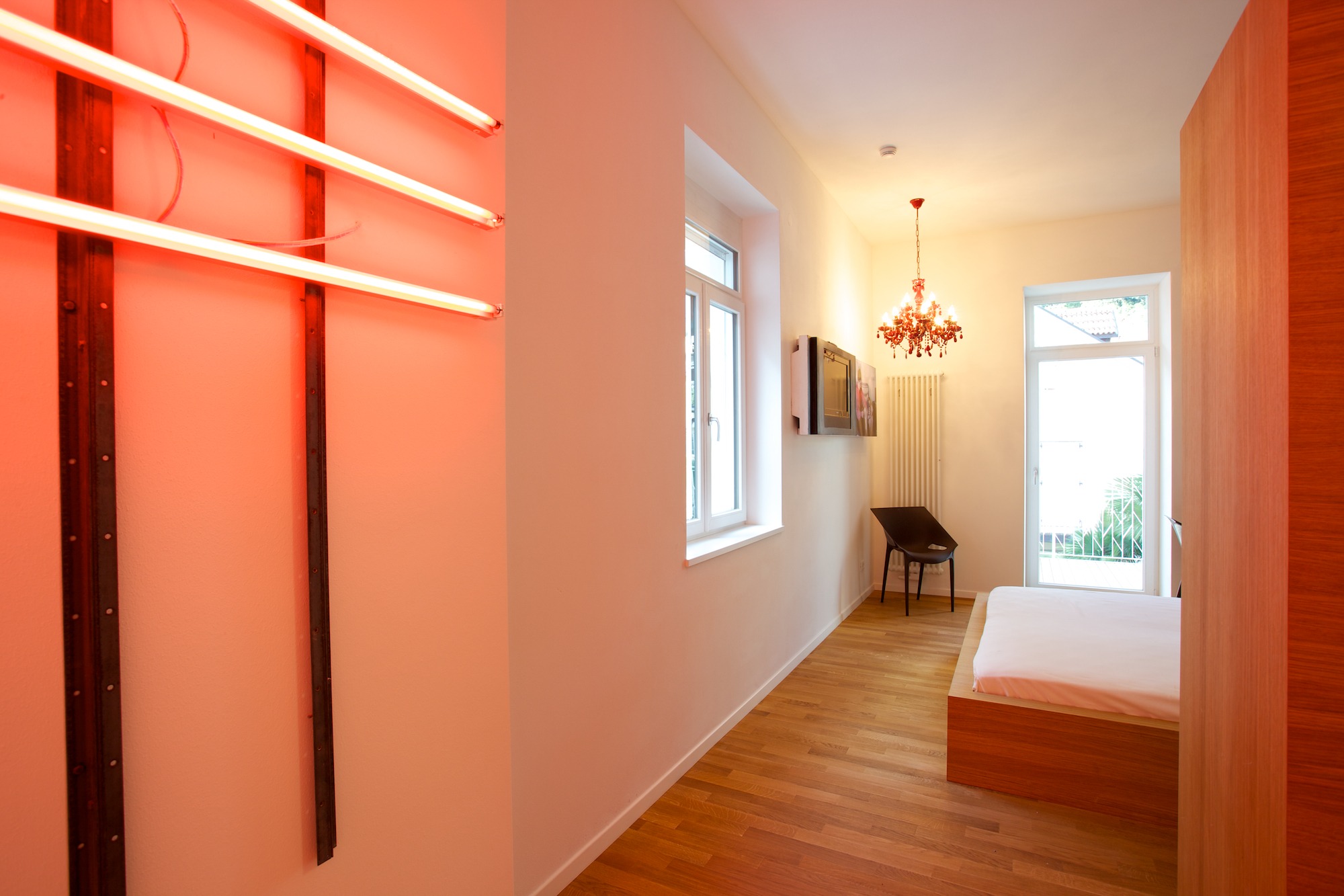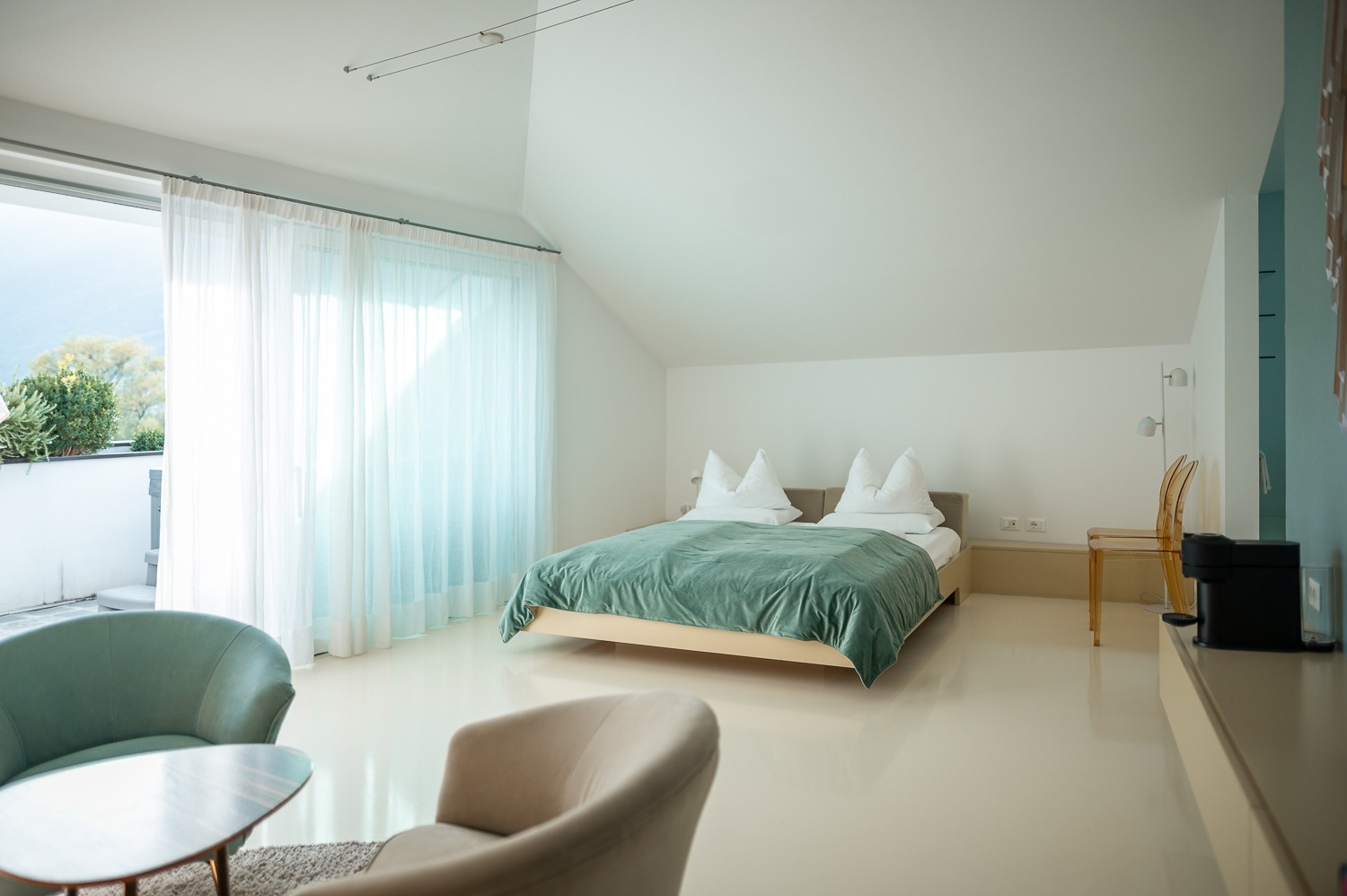 der helle raum vermischt gekonnt architektur und kunst. ganz im naturell seines kreativen erschaffers ulrich egger. heller holzboden, weiße möbel, klare formen - das gefühl auf wolke ∞ zu schweben. und im whirlpool auf dem dach einen 360° blick über meran und seine berge genießen. urlaub mitten in der stadt in einer neuen dimension - kunst, architektur, meran eine wunderbare liason.