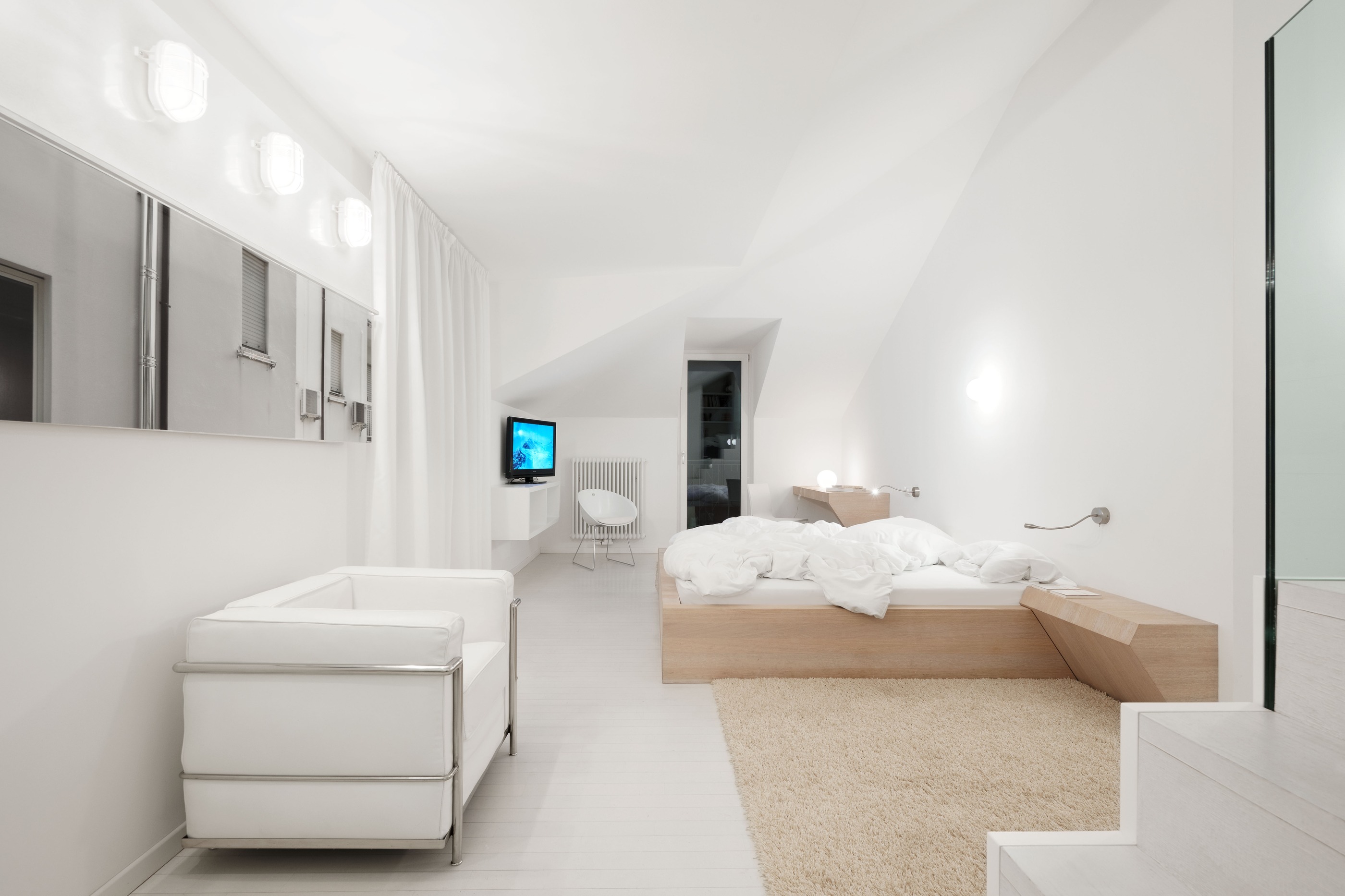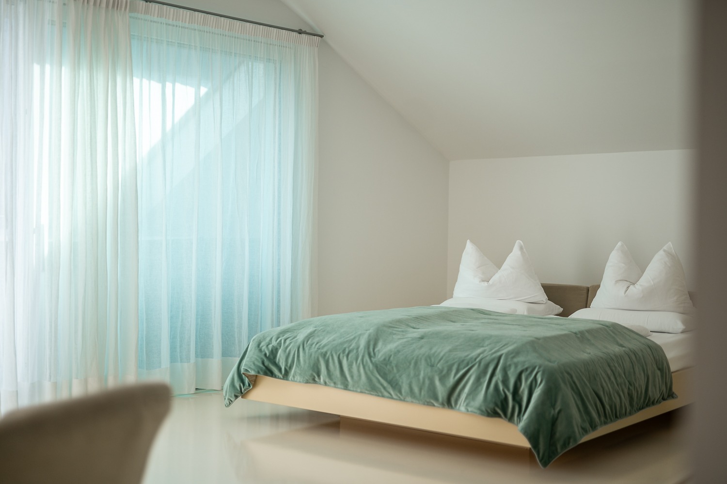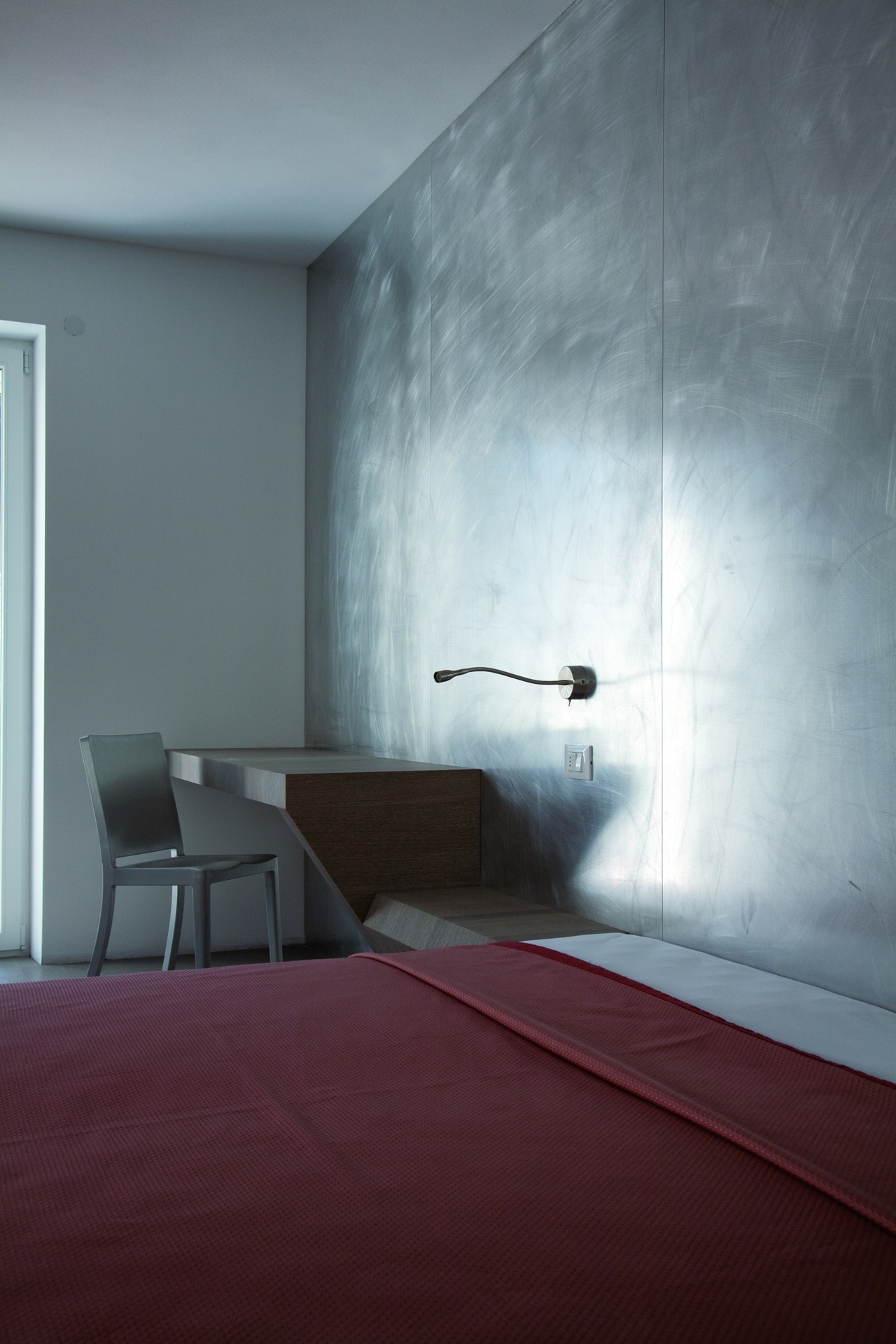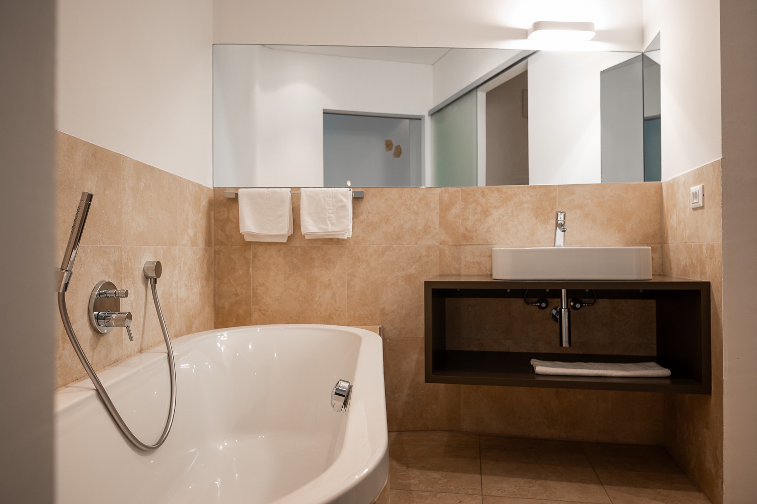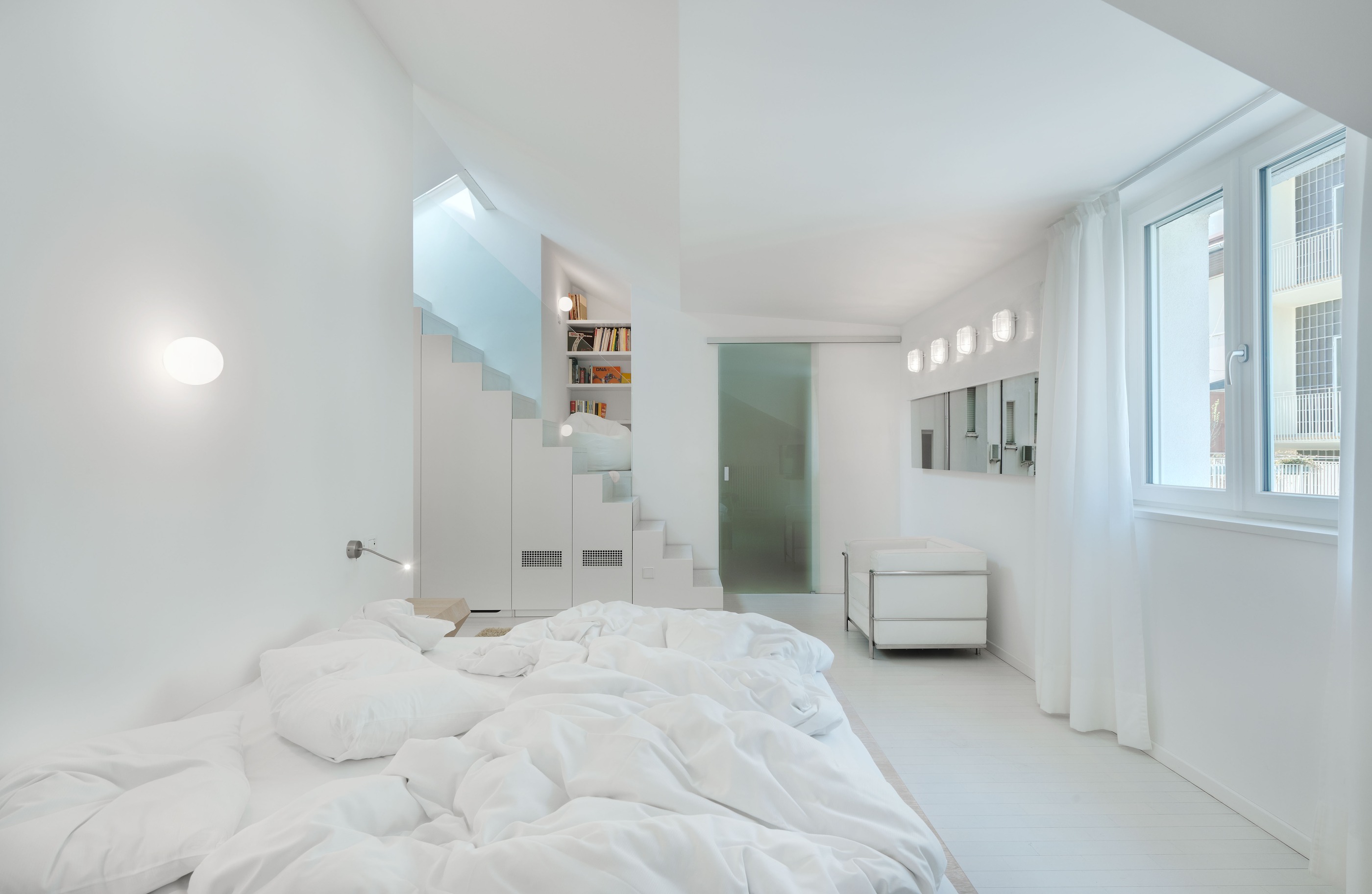 der helle raum vermischt gekonnt architektur und kunst. ganz im naturell seines kreativen erschaffers ulrich egger. heller holzboden, weiße möbel, klare formen - das gefühl auf wolke ∞ zu schweben. und im whirlpool auf dem dach einen 360° blick über meran und seine berge genießen. urlaub mitten in der stadt in einer neuen dimension - kunst, architektur, meran eine wunderbare liason.
