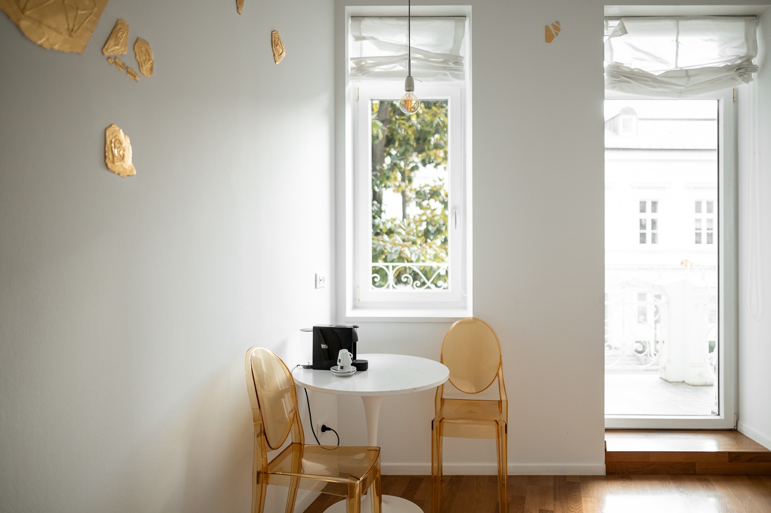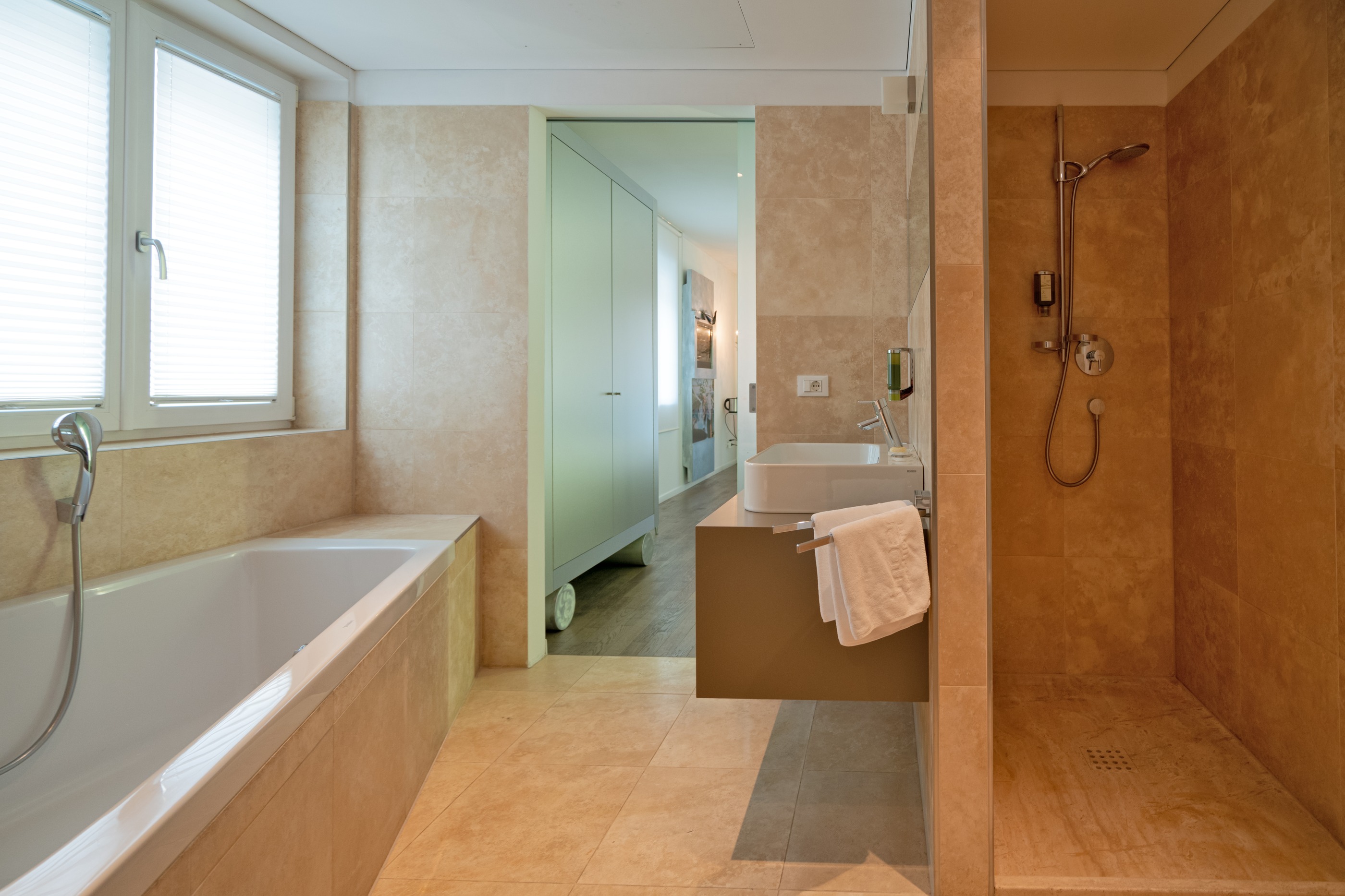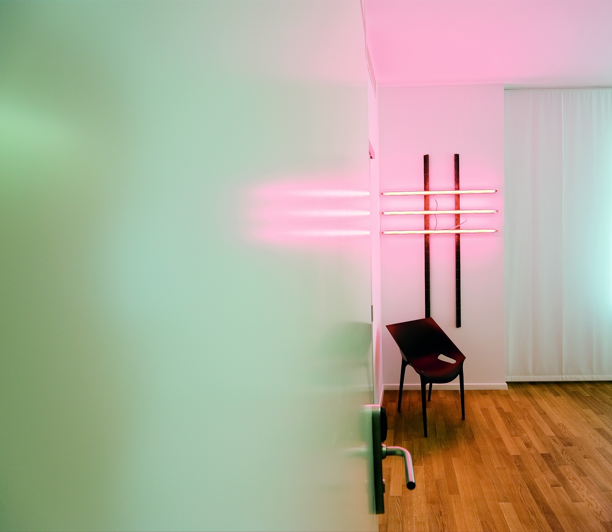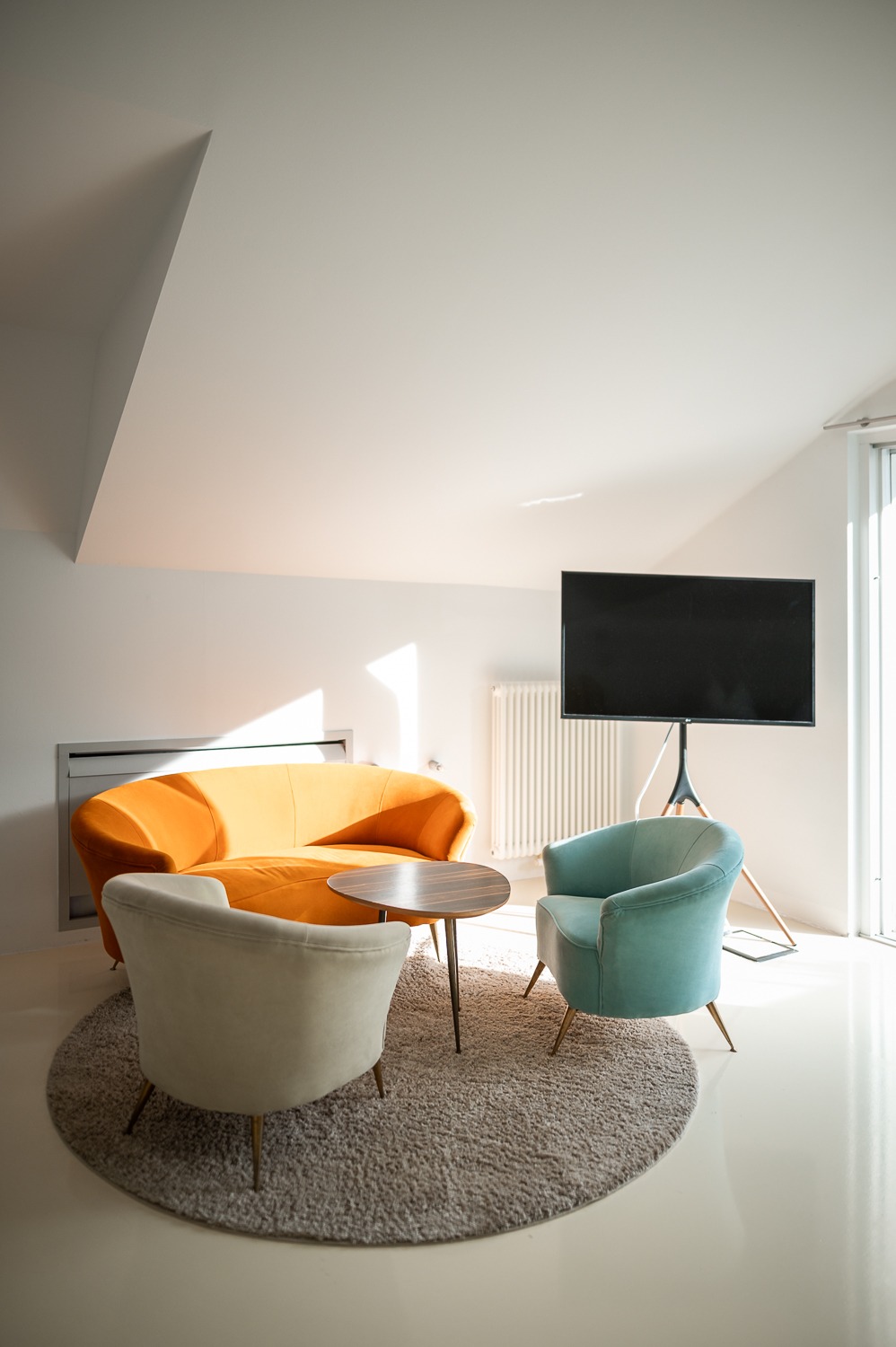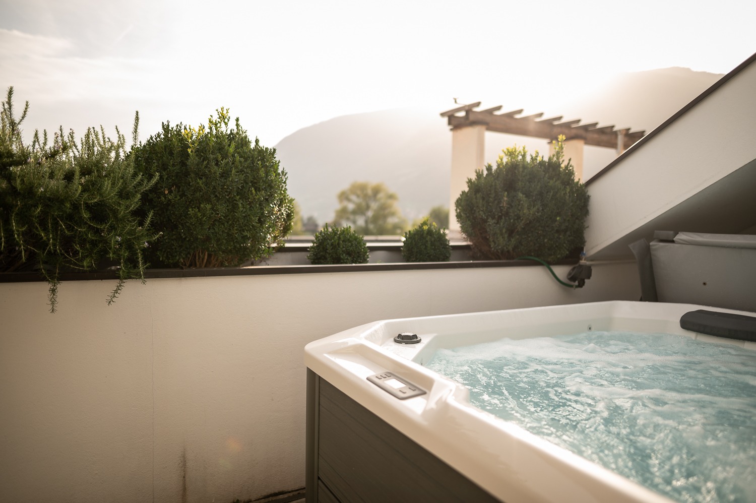 der helle raum vermischt gekonnt architektur und kunst. ganz im naturell seines kreativen erschaffers ulrich egger. heller holzboden, weiße möbel, klare formen - das gefühl auf wolke ∞ zu schweben. und im whirlpool auf dem dach einen 360° blick über meran und seine berge genießen. urlaub mitten in der stadt in einer neuen dimension - kunst, architektur, meran eine wunderbare liason.