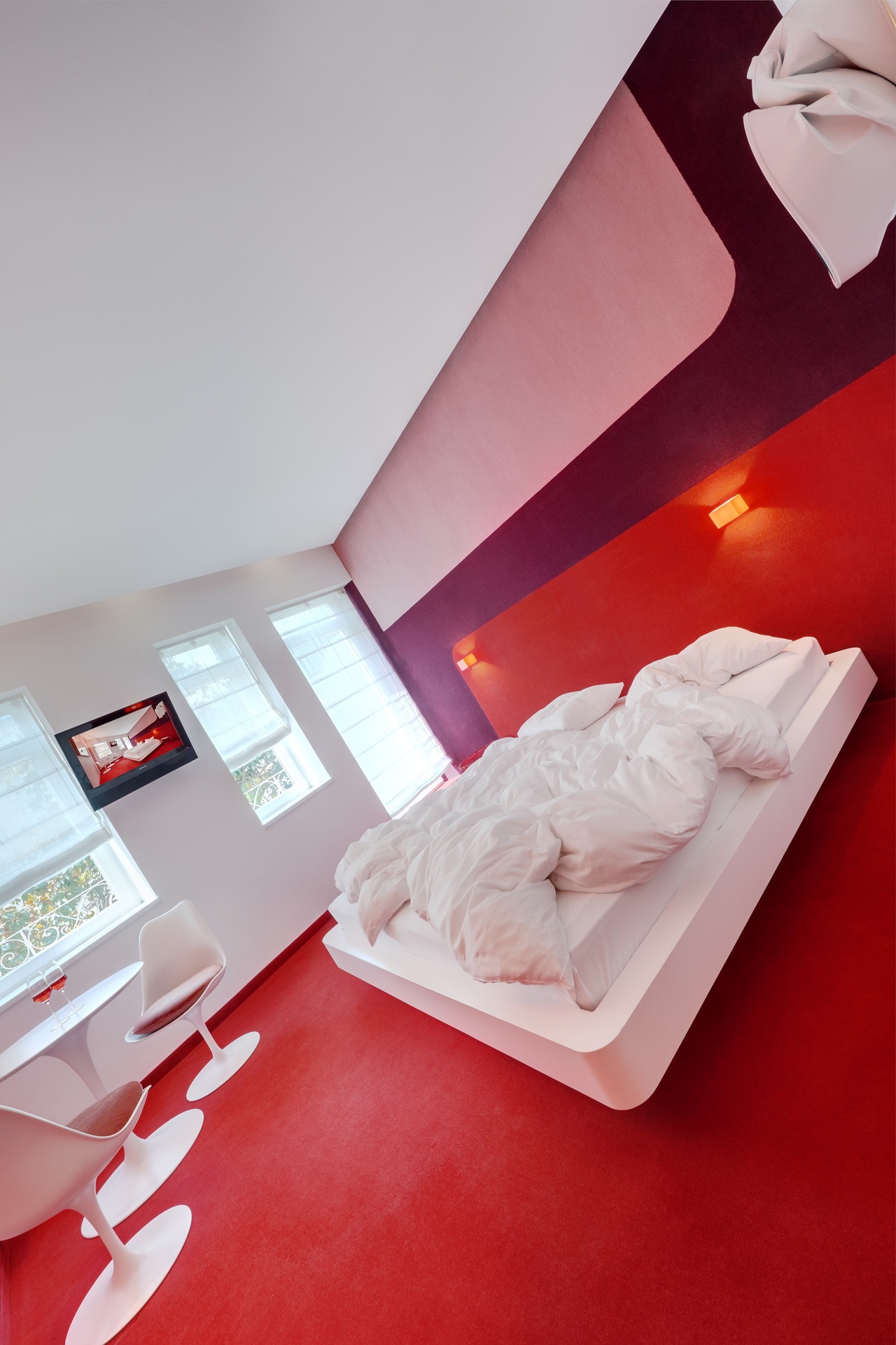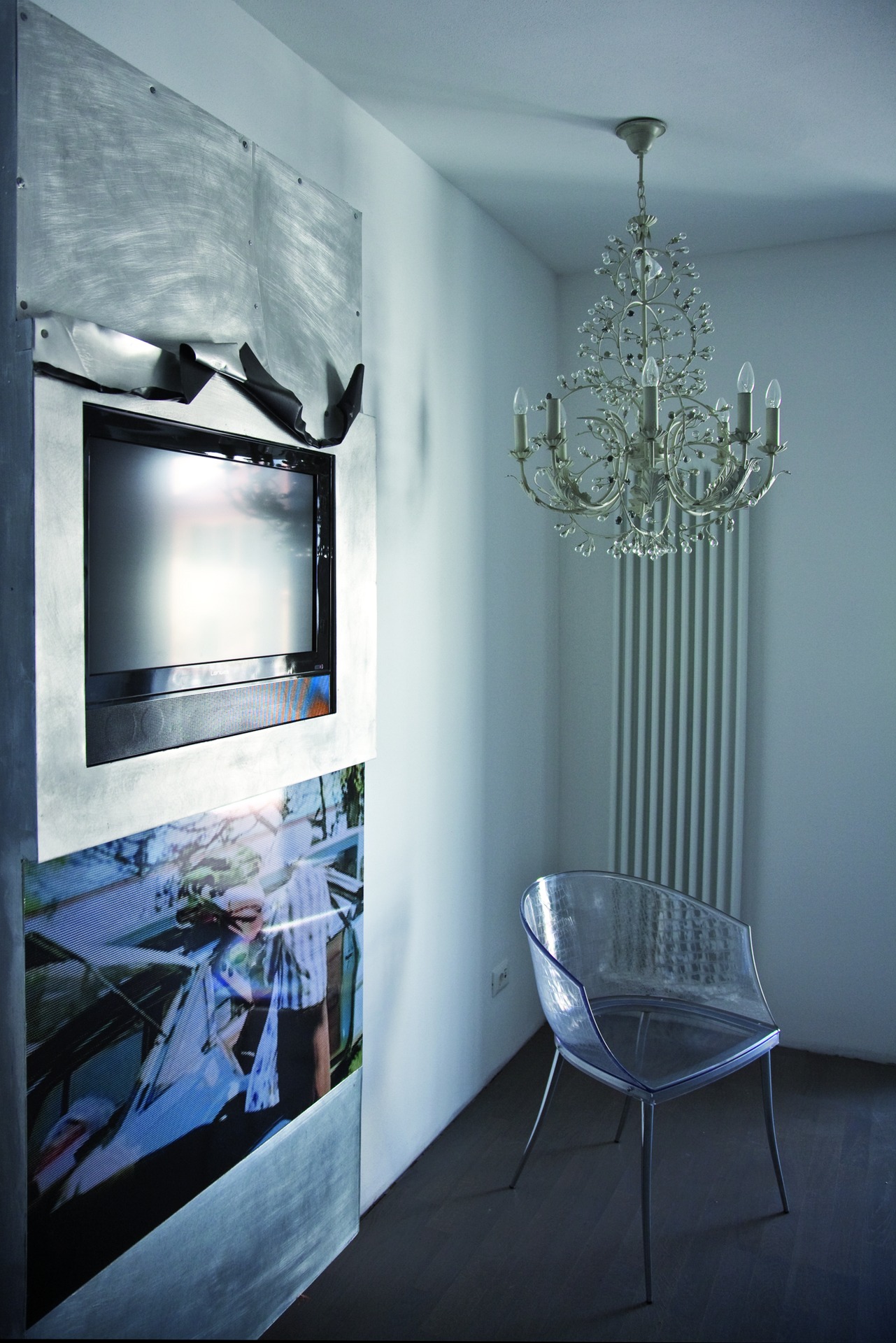 der künstler ulrich egger hat aus klassischen hotel-einrichtungs-gegenständen kunstobjekte geschaffen, die dem bewohner dieses raums eine botschaft senden. welche? die sei jedem selbst überlassen. man frage sich warum der schrank rollen hat und der tv zur skulptur wird!?
