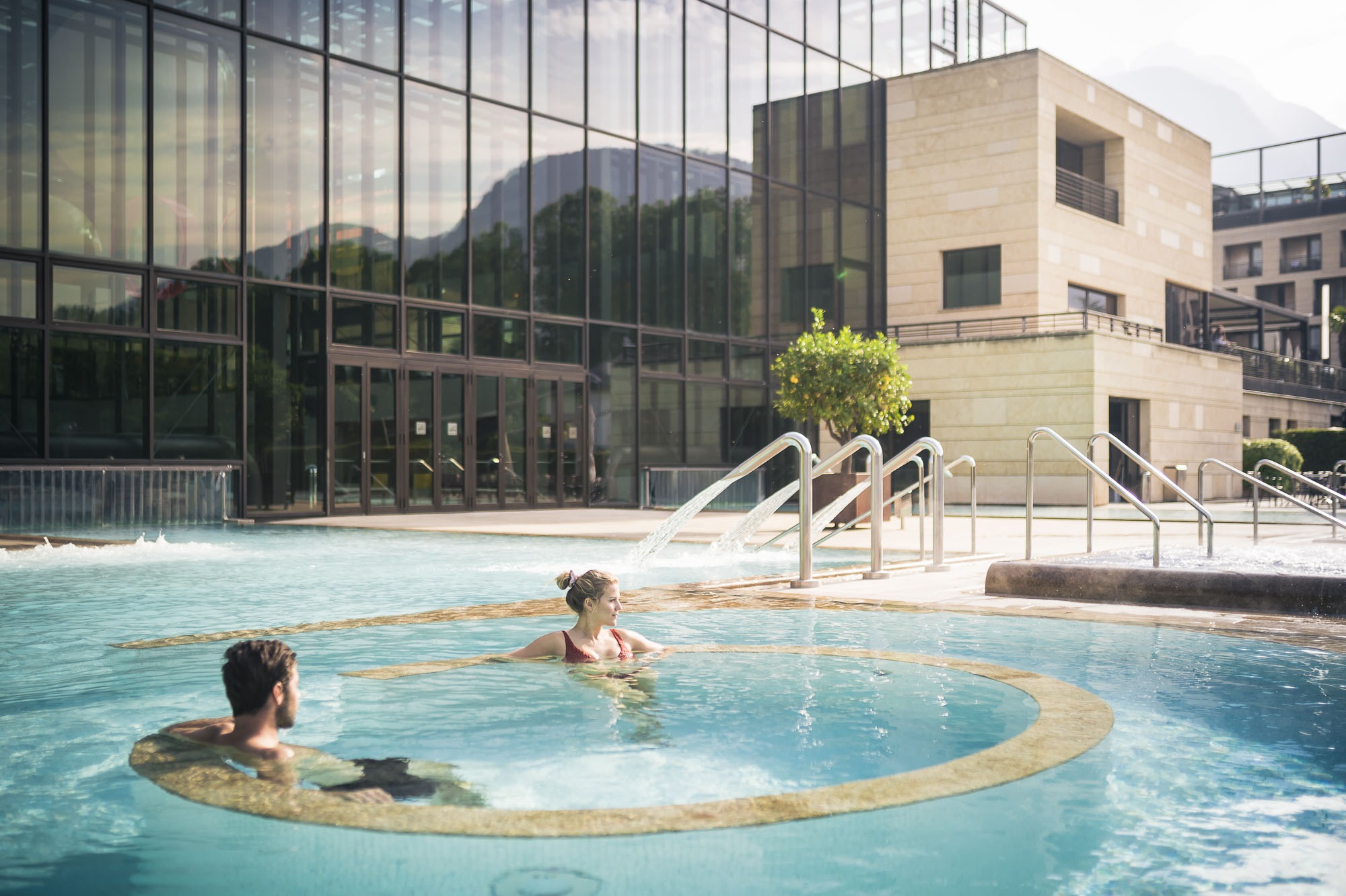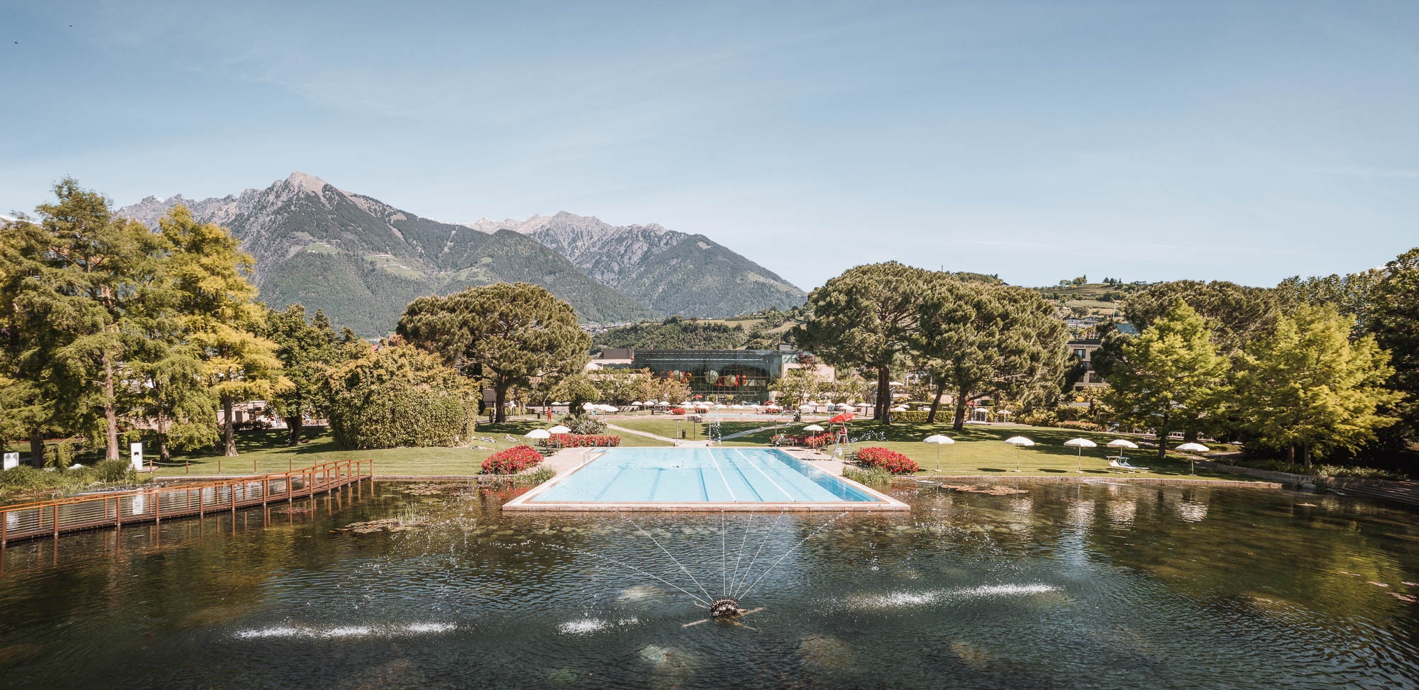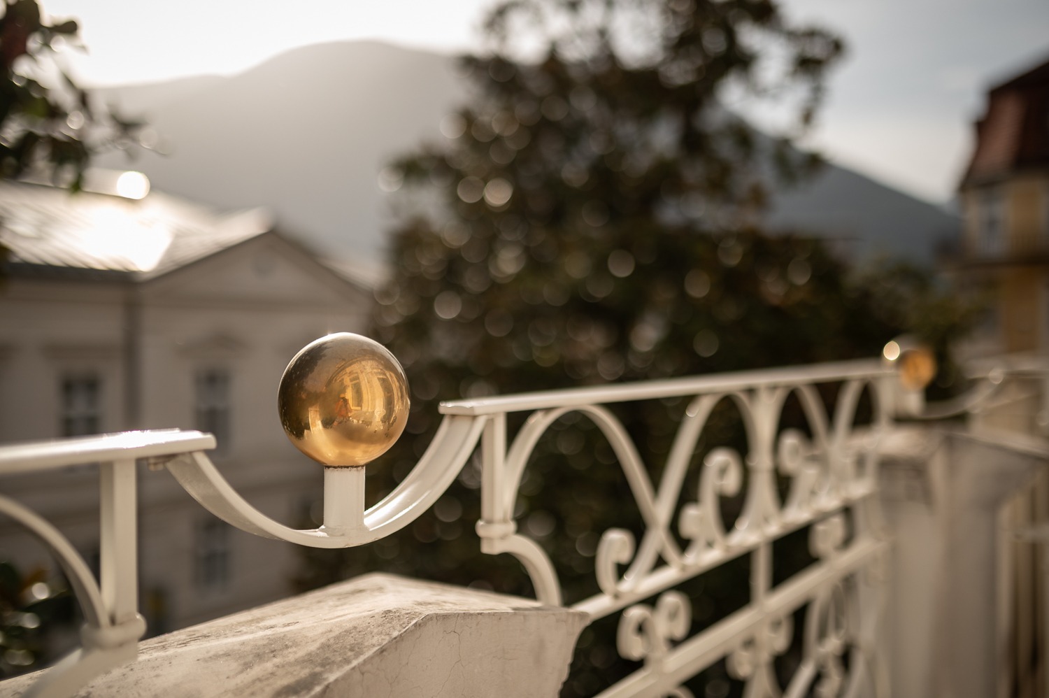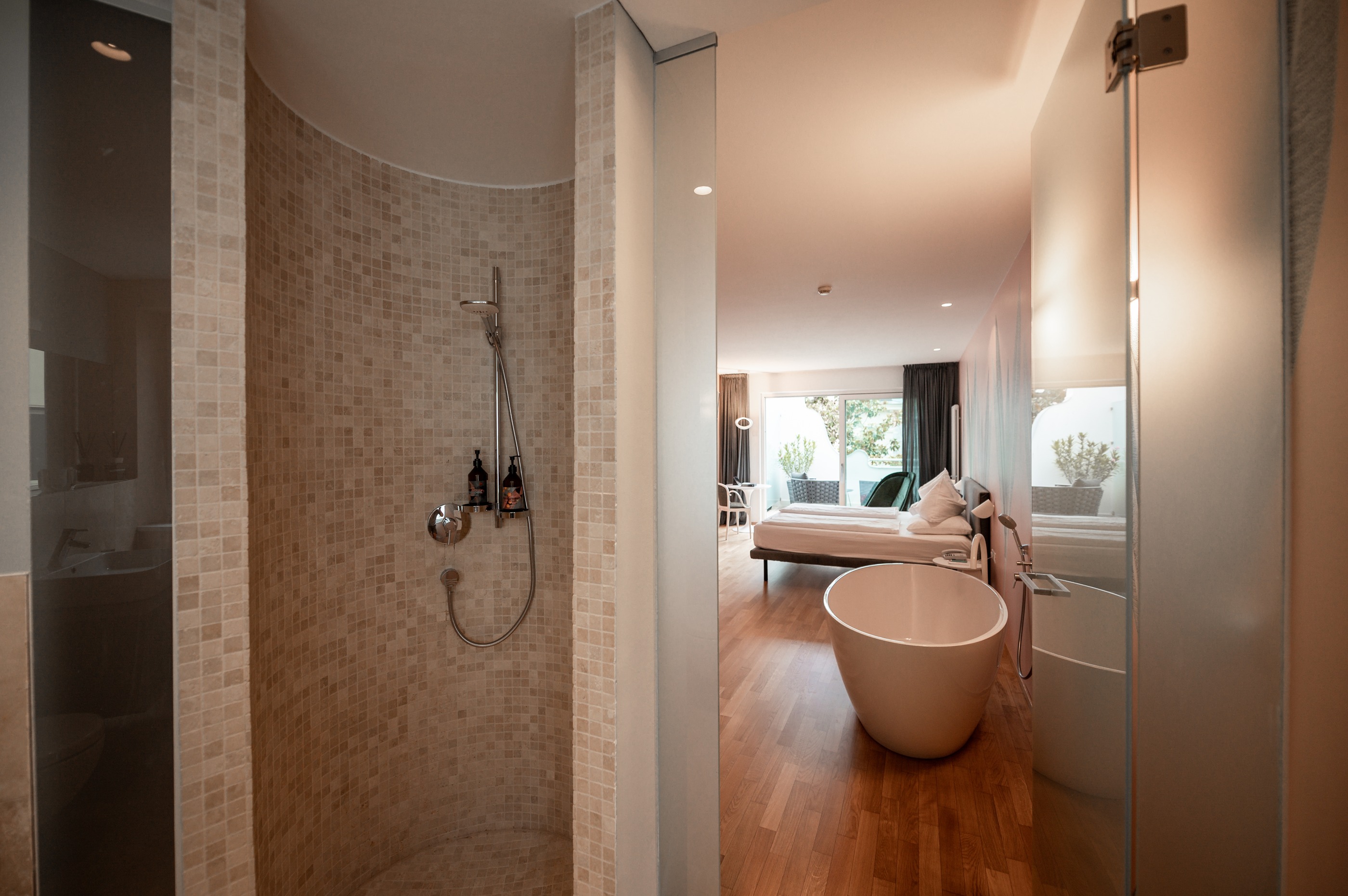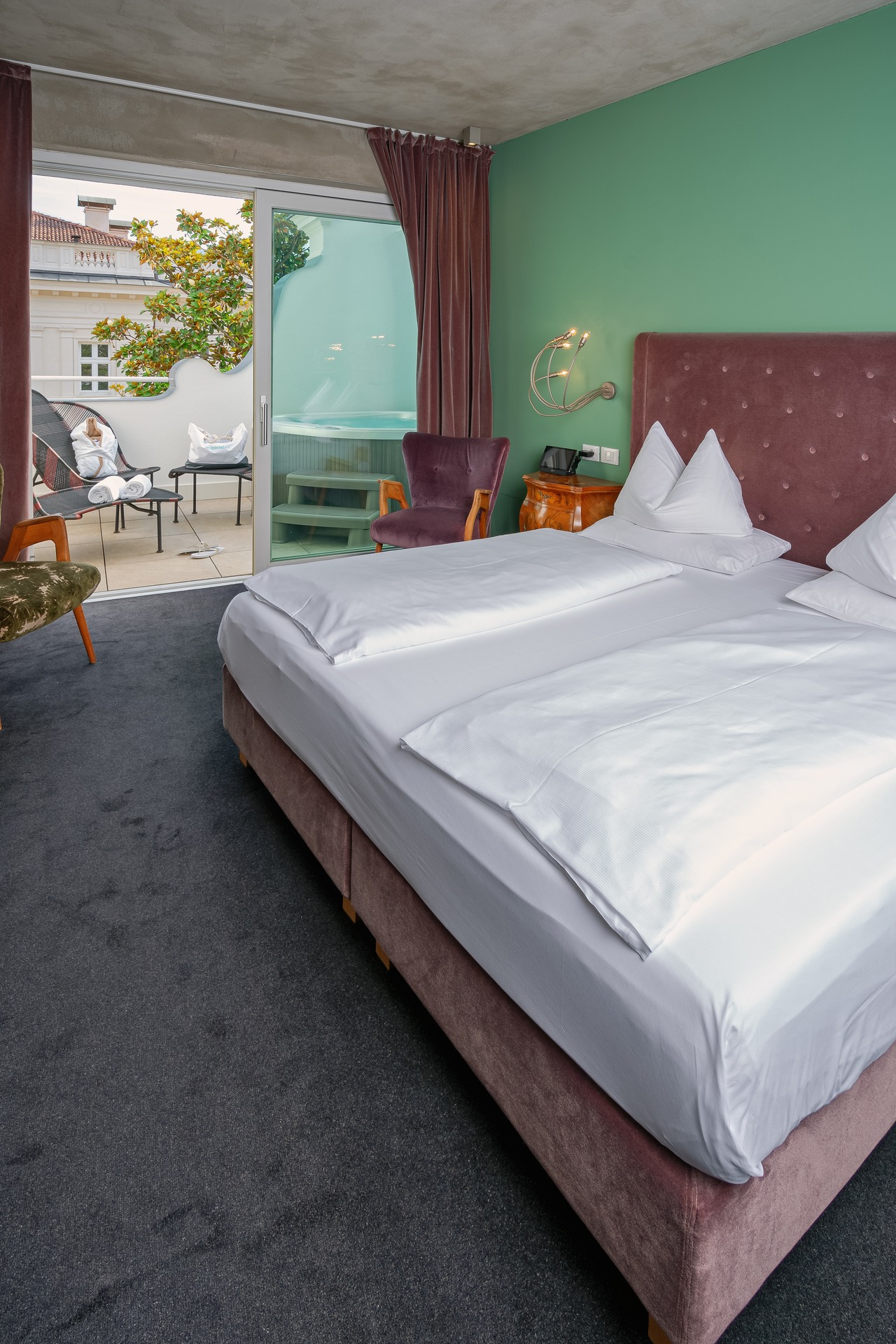 künstlerin elisabeth hölzl schafft mit diesem zimmer ein völlig neues raumkonzept. die luster tapete, die zarten wie pastelligen farben, die zeitgleich nostalgisch wie modernen möbel, die freistehende badewanne, der whirlpool auf der terrasse: therme wird zum zeitlosen raumgefühl. und wo passt das besser als in der kurstadt meran? genau, nirgendwo.