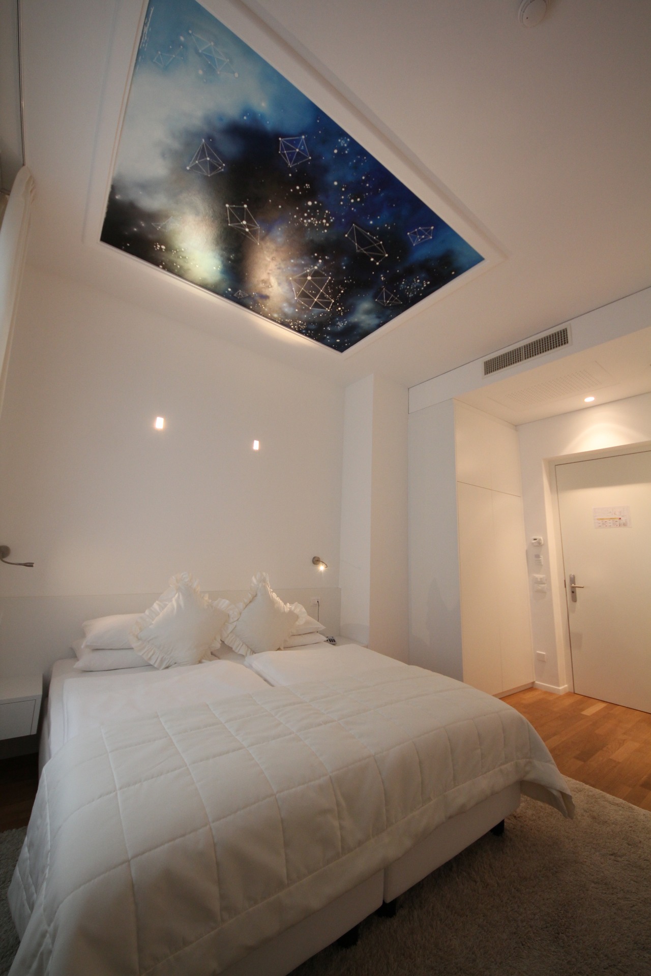 unverkennbar im stil: marcello jori. an der decke befinden sich die vom künstler gemalenen kristalle, man schaut nach oben und taucht sofort ab oder ein: in einen neue galaxy. wie gemacht zum träumen, denken und verweilen.